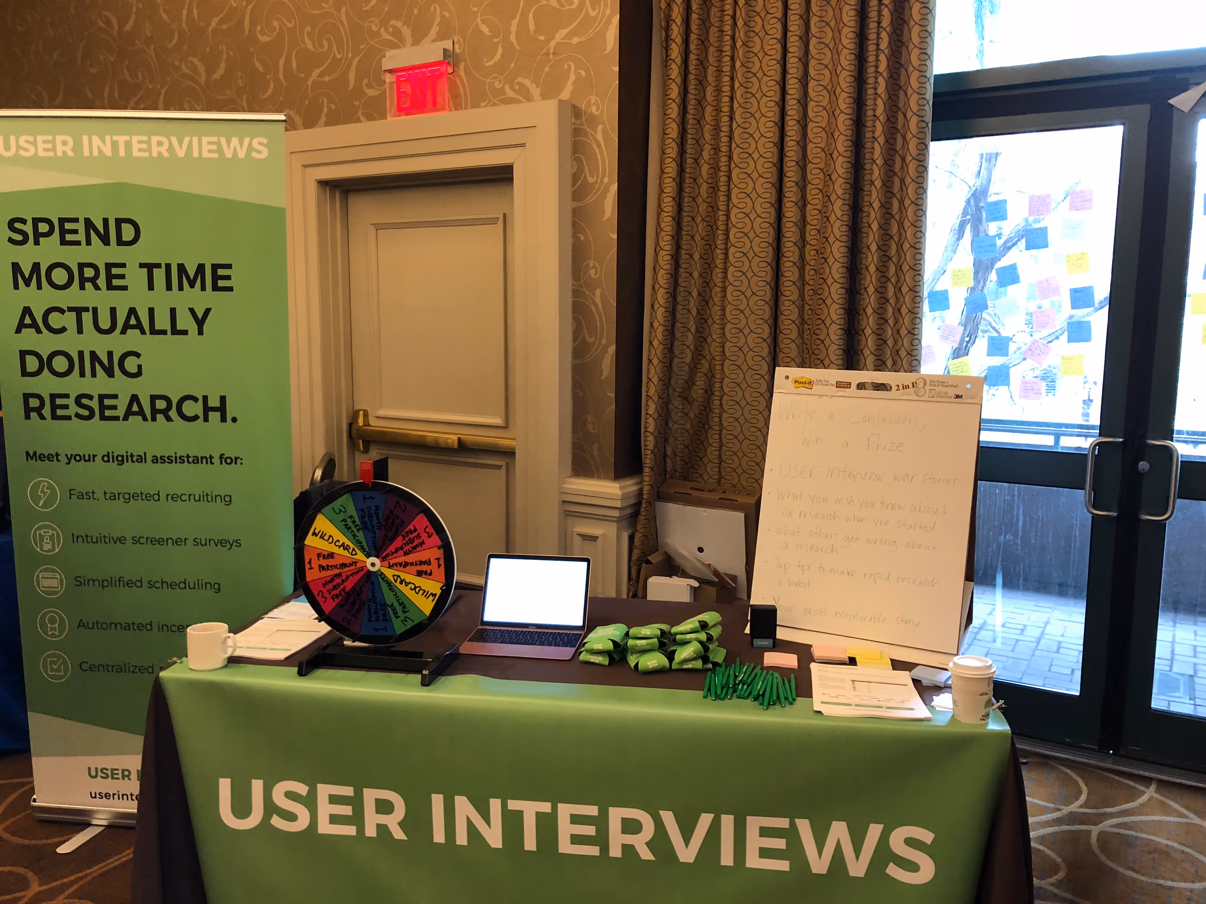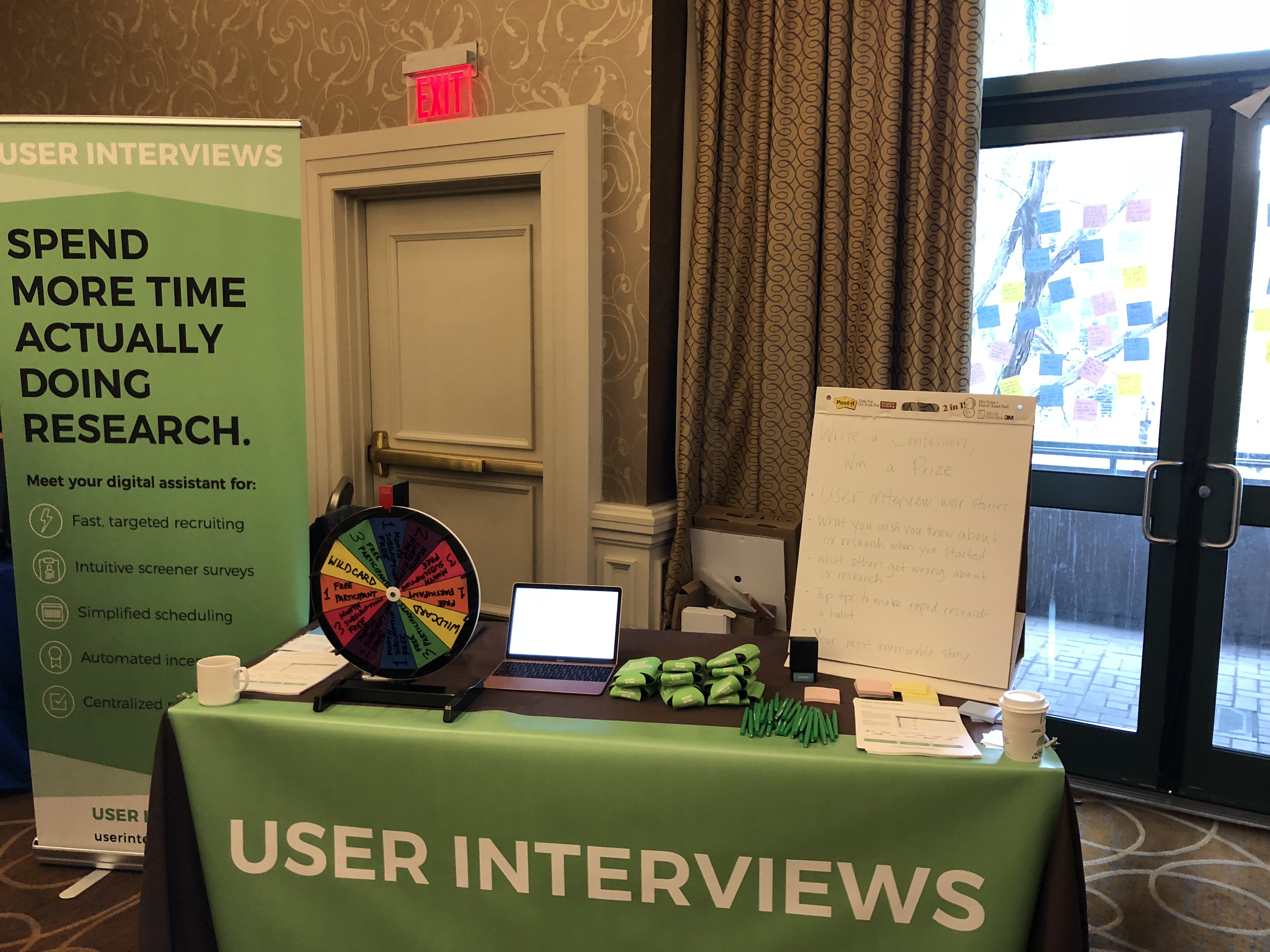 This was our first large event together, so we did a lot of winging it, and even better, having fun. We decided to go for koozies (fun, useful) felt tip pens (the choice pen of the discerning UXer) and an interactive experience. Write a Post-it® confession, story, or tip from your UX research experience, then spin a wheel for a prize. Prizes included free participant recruitment, and months off our soon-to-launch subscription offering. Everyone seemed to enjoy the activity, and we were delighted when attendees asked us to explain what our company actually does! (Elevator pitch available by request at erin@userinterviews.com).