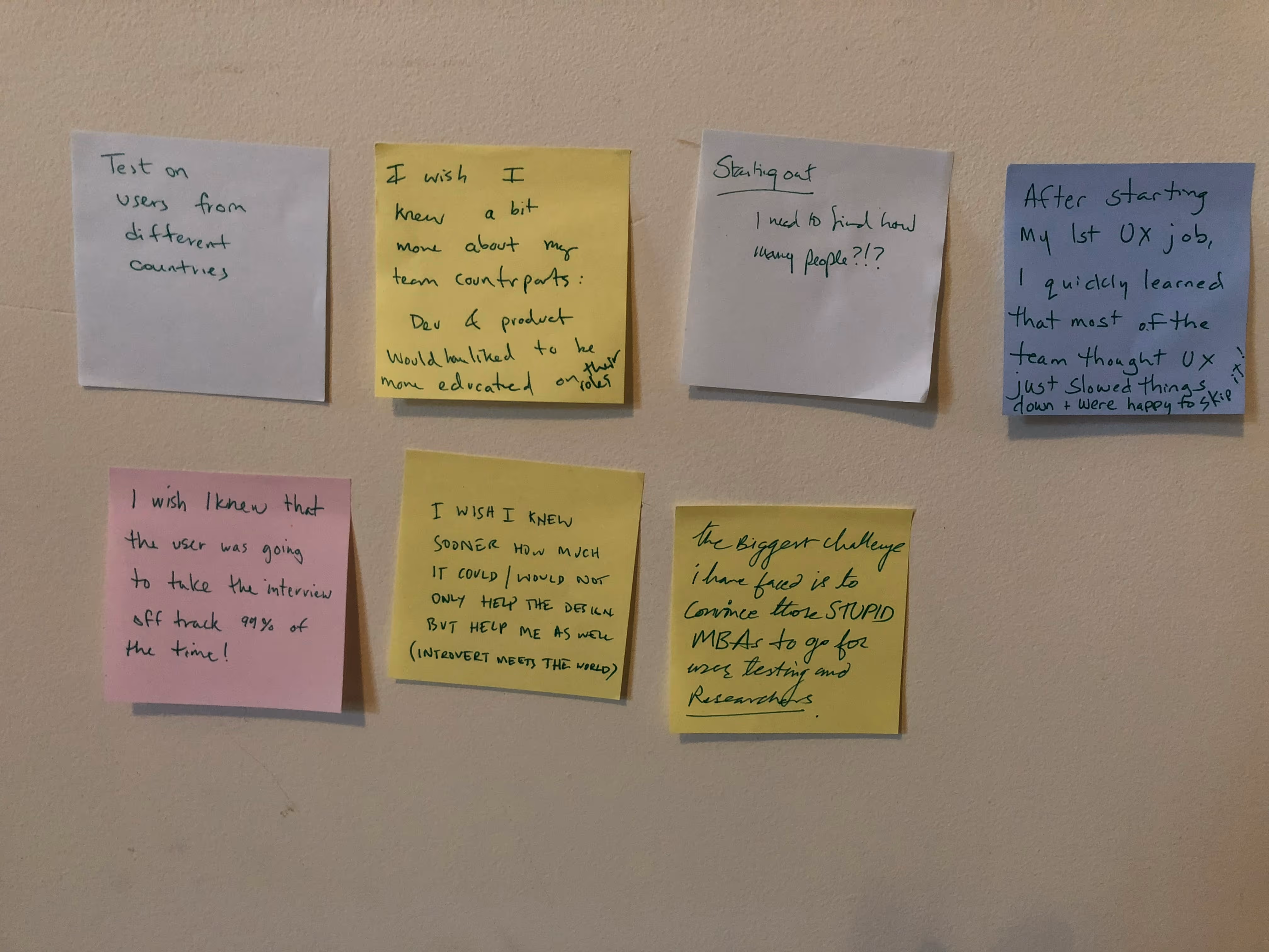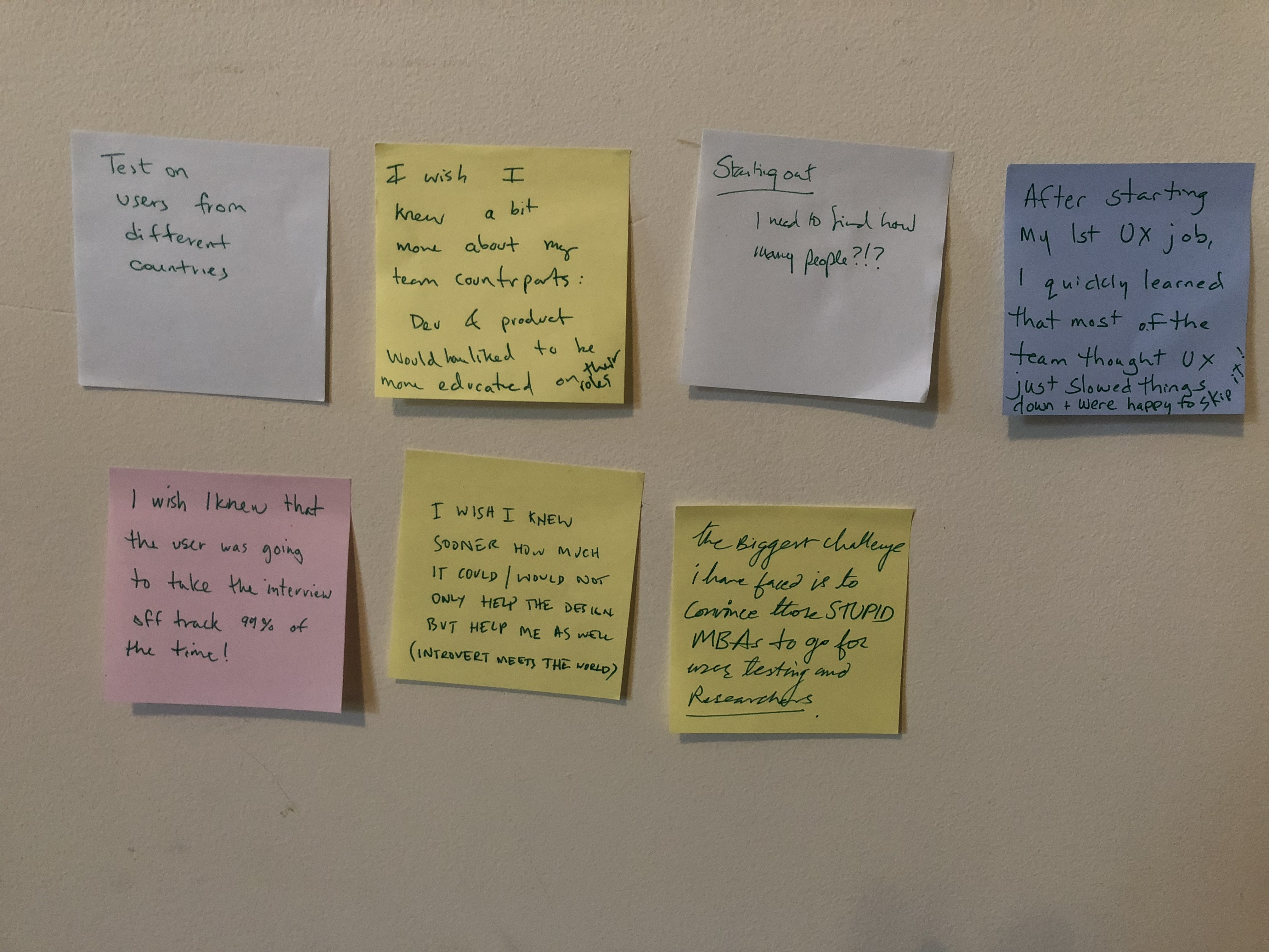 We gave people some basic prompts to choose from, but left it pretty open. Share a user interview war story, tips you’ve learned over the years, “unconventional” wisdom, what you wish you knew when you started, or really whatever you felt like. So, I did my best to organize the Post-its in a sort of open/closed card sort of 1. It’s best if you imagine “Everywhere” by Fleetwood Mac playing in the background, because that’s what was going on.