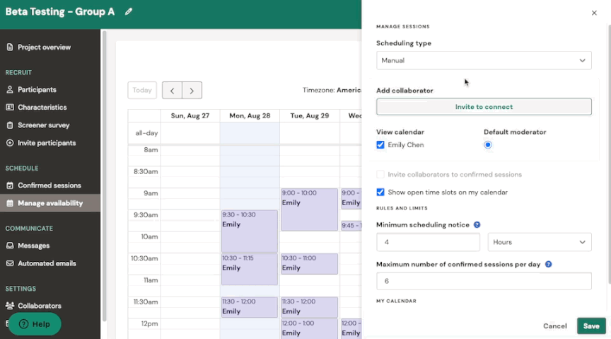 After you’ve launched a project, you can now switch to automatic scheduling for 1:1 moderated, single researcher projects (projects with collaborators coming soon!). From the “Manage availability” tab, select “Automatic'' as your scheduling type.