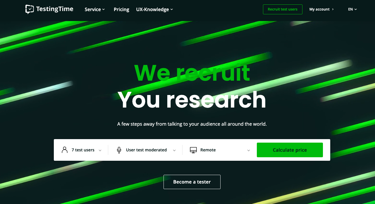 TestingTime is an on-demand recruitment service that provides access to a panel with participants across Europe and North America. Researchers can recruit for moderated interviews, unmoderated usability tests, or group studies, with automated scheduling and reminders included to minimize no-shows.