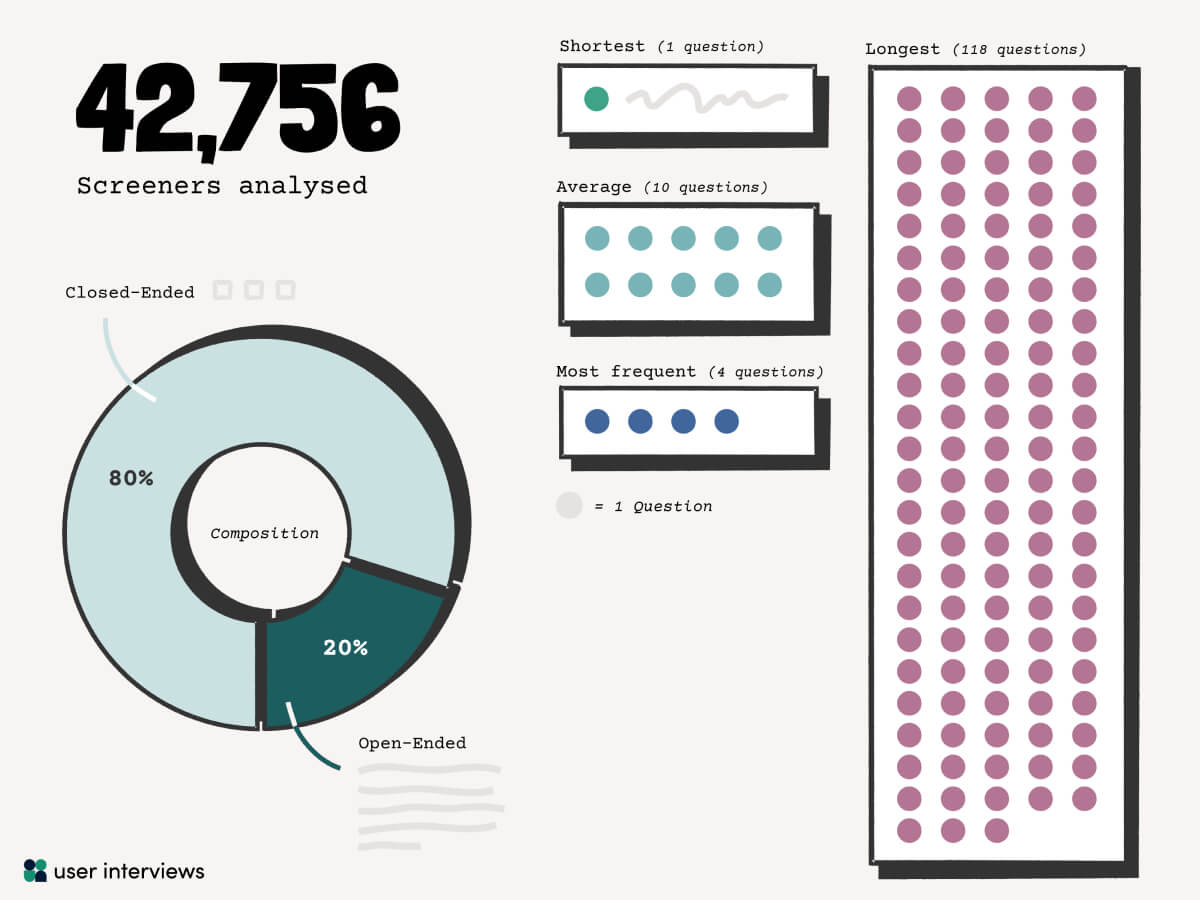 - Follow the 80/20 mix: The most effective screeners in our dataset averaged 10 questions, with roughly 80% closed-ended and 20% open-ended. This balance keeps completion rates high while still giving you qualitative detail to verify fit.