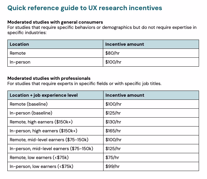 Our UX research incentives cheat sheet provides recommended incentive rates based on study type: