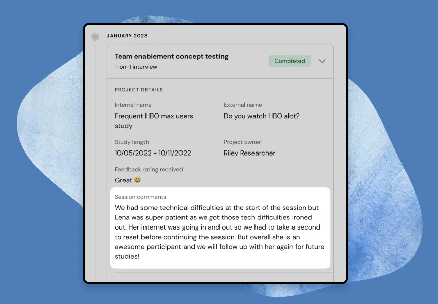 The platform also stores key information in detailed participant profiles so research teams can track past projects, engagement, and incentive history. You can also leave feedback or view session notes left by anyone on your team. This helps you quickly decide who’s a good fit for future studies.