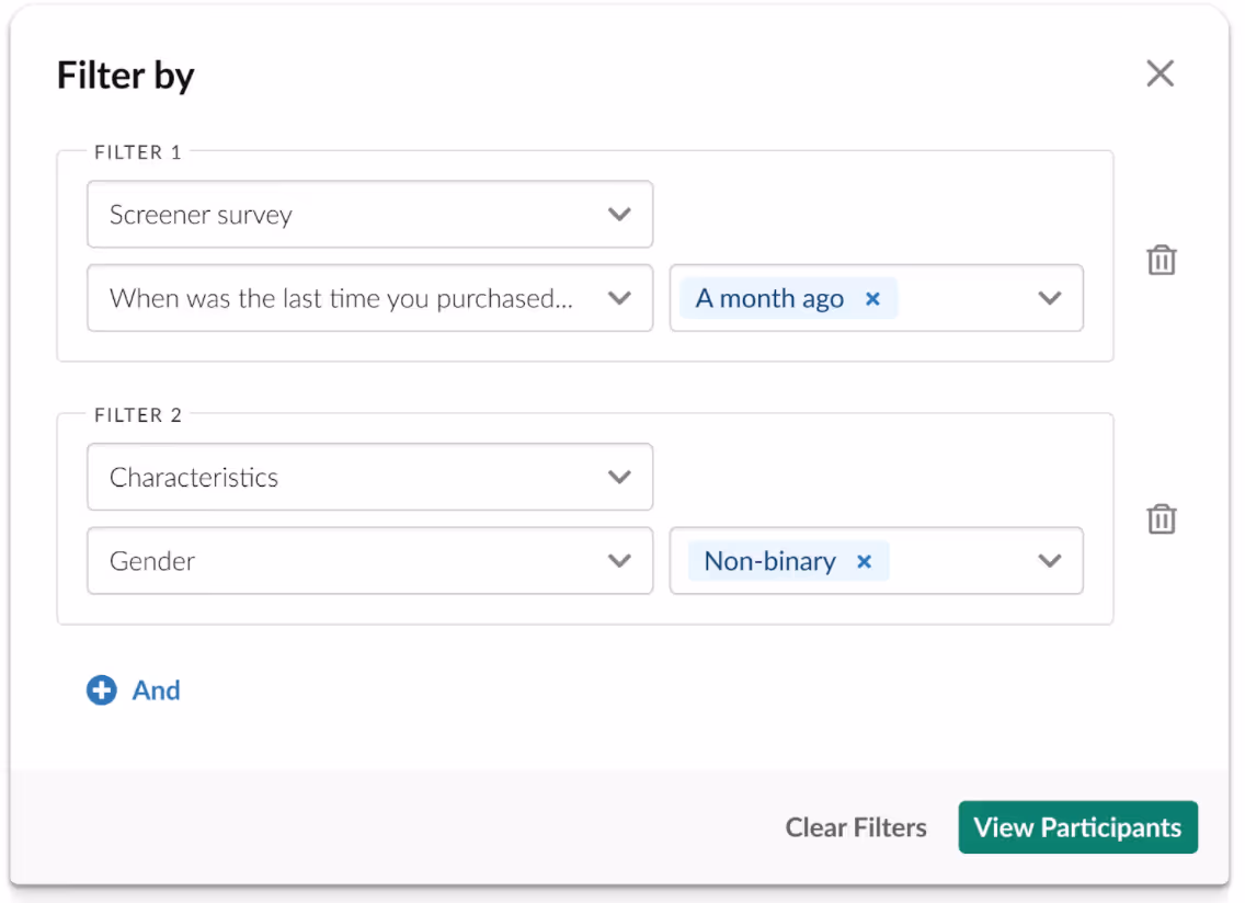 - Multiple selections within a single filter are treated as or statements. For example, if you apply a filter for “Level of education” and select “Bachelor’s degree” and “Master’s degree”, participants who have either a Bachelor’s degree or a Master’s degree will be displayed in the results.