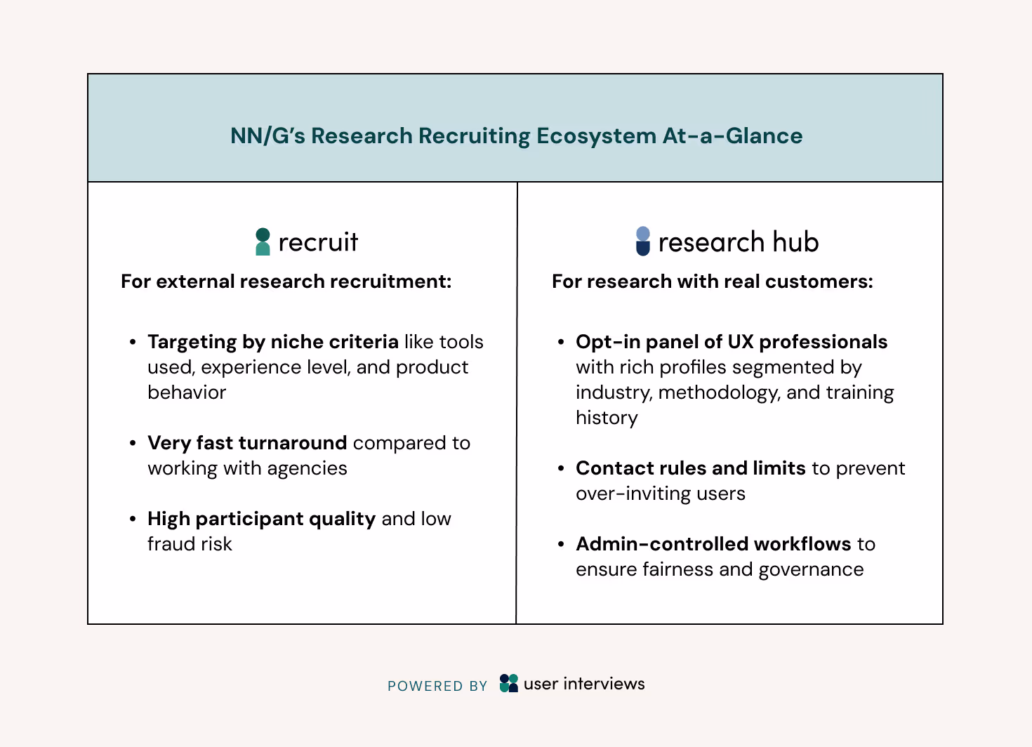 Maria and her team found that User Interviews offered a rare trifecta: participant quality, speed, and cost-efficiency. To meet the demands of both broad consumer studies and high-expertise UX research, NN/G set up custom panel infrastructure using User Interviews’s Recruit and Hub tools in tandem. This hybrid approach allows the team to move fast without sacrificing participant quality or research rigor.