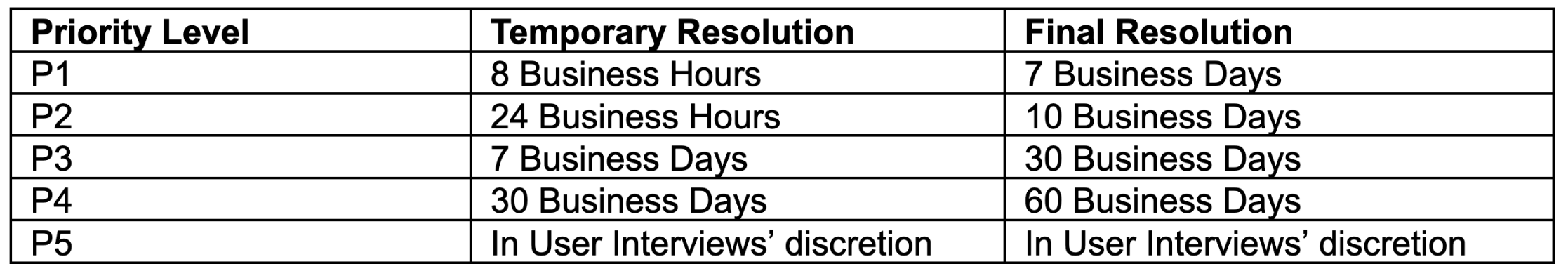 Subject to the terms and conditions of the Agreement, User Interviews will provide the following support for the Services during the applicable Subscription Period. Customer’s sole remedy for any breach by UI of this SLA will be the Service Credit as specified herein.