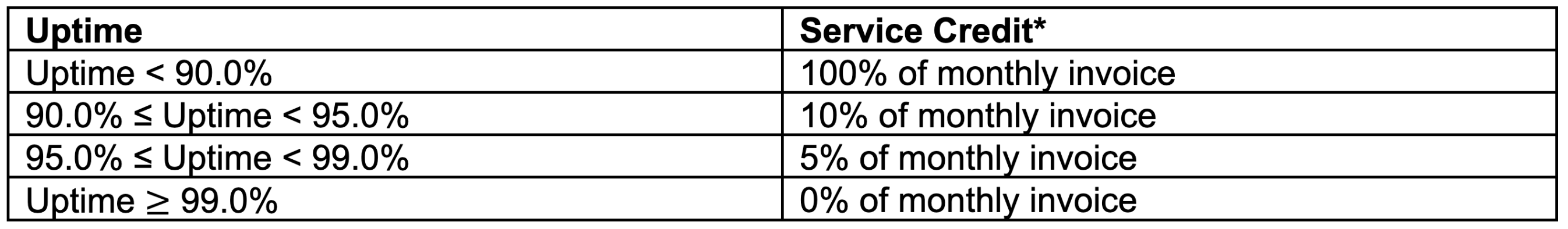 *If Customer is invoiced on a quarterly basis, the amount subject to the Service Credit calculation for the affected month will be 1/3 of the total invoice value. If Customer is invoiced on an annual basis, the amount subject to the Service Credit calculation for the affected month will be 1/12 of the total invoice value.