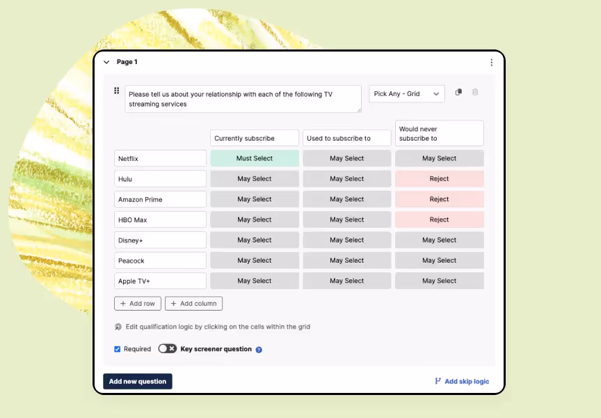 Creating a grid question is easy—in the screener builder, you’ll have the option to select “Pick Any - Grid” or “Pick One - Grid” from the question type dropdown. To set up your qualification logic, simply click on the cells within the grid.
