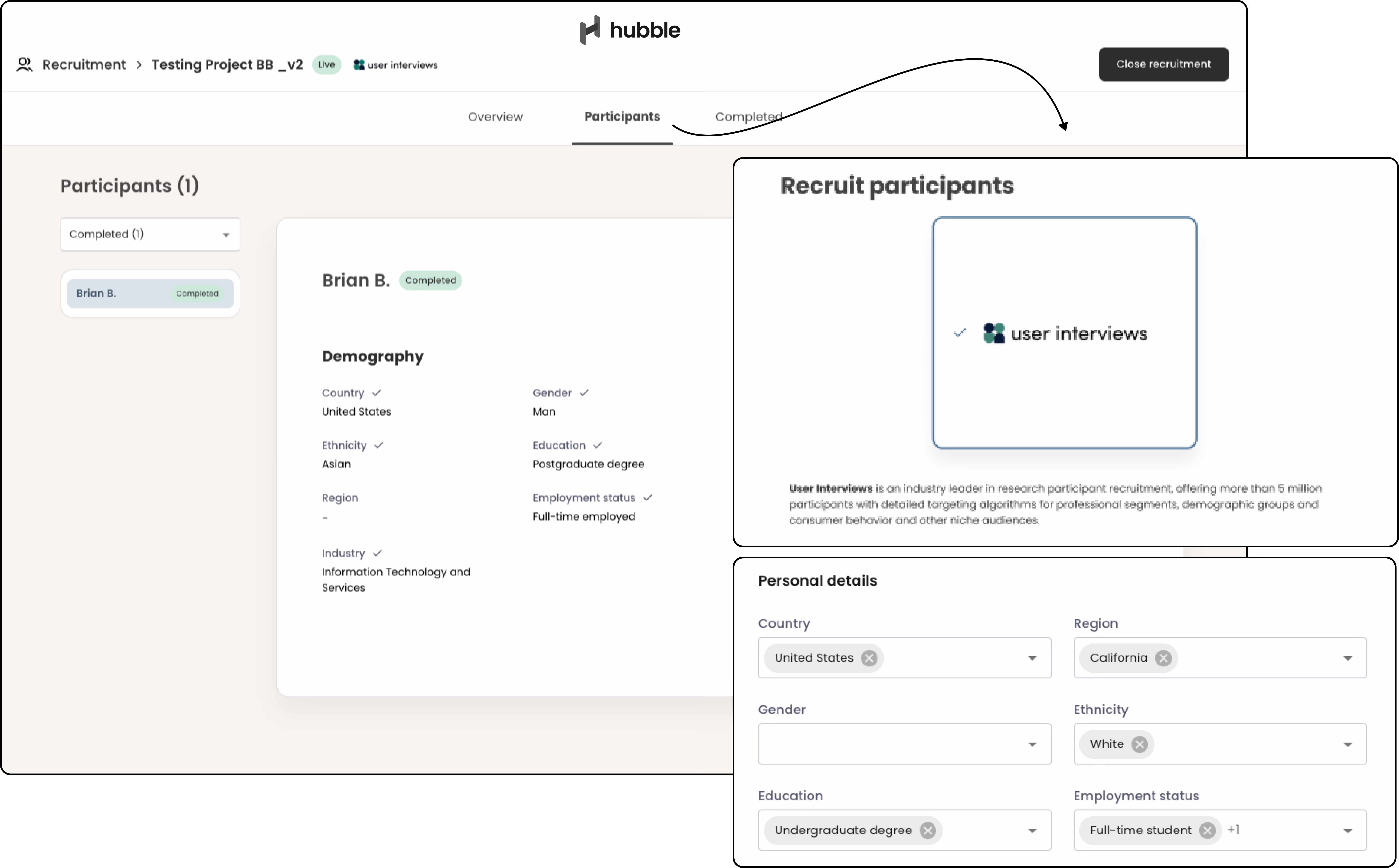 We’re excited to announce the newest launch partner for our recruitment API, Hubble! Our panel of over 5 million participants will now be available to recruit from directly within the Hubble platform. Hubble users will get on-demand access to the powerful targeting, screening, and qualification capabilities that User Interviews is known for.