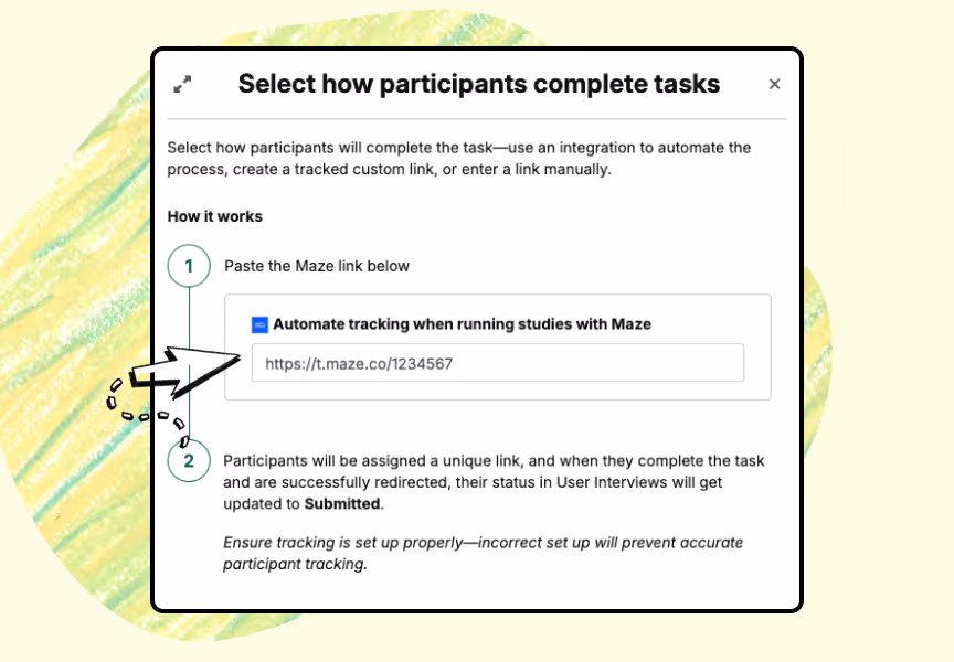 Follow the steps to connect the two tools. All you need to do is grab your Maze session link and paste it into User Interviews—that’s it! This link will redirect participants back to User Interviews after they complete the task.