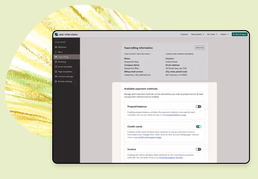 You can manage your team’s payment methods in your Admin settings, under the “Team Billing” tab. Under Available payment methods, simply toggle on/off to configure which payment methods are shown to your researchers at the time of project launch.