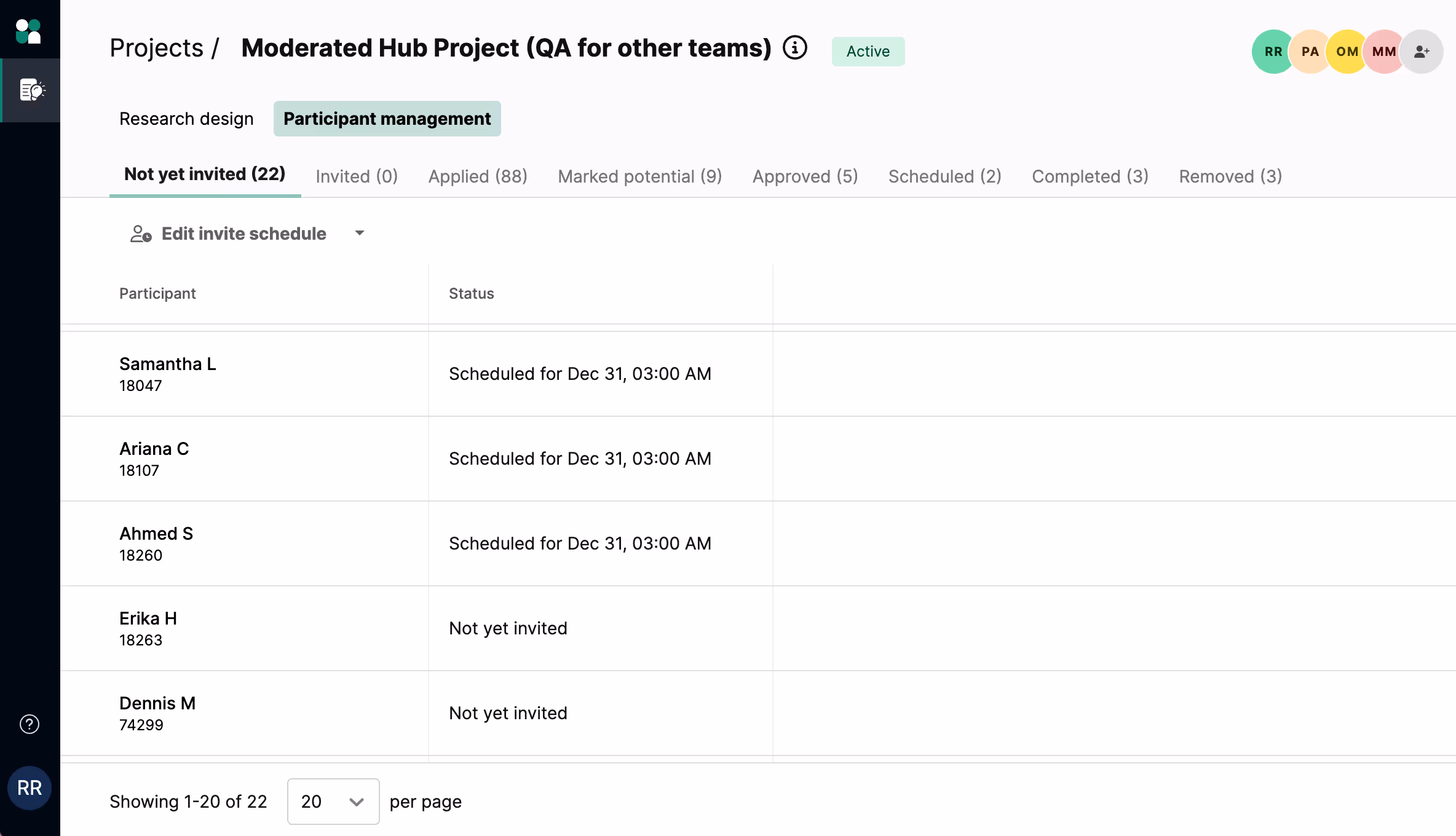 This tab shows participants you’ve added to your project (via Hub or csv). This is where you can view your entire potential participant list and schedule invitations.