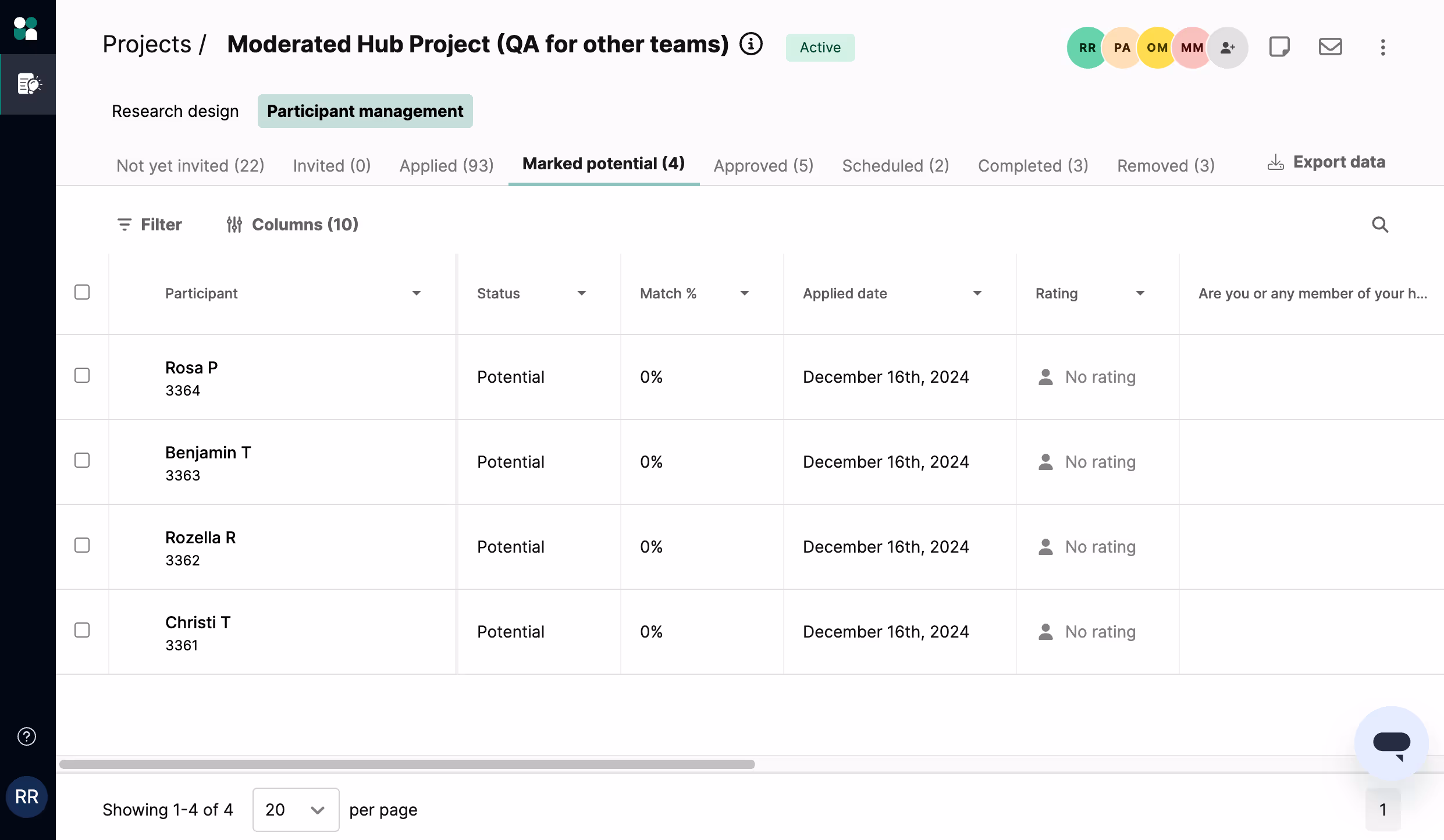 In the “Participant management” section of your project’s workspace, you’ll see applicants organized into clear stages of the participant “funnel” as they progress through your study. Each stage has its own set of default columns tailored specifically to that stage.