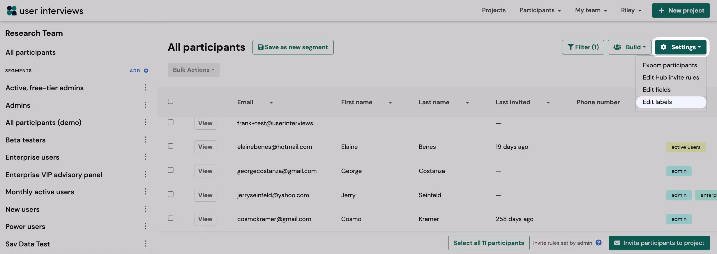 From there, you'll be able to rename or delete existing labels. These changes will be reflected on all participants the label is applied to.