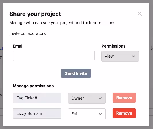 When you open the project, you'll see collaborator icons at the top right of the screen. Click this, and a modal will open up where you can invite collaborators and comment on drafts. Type your questions, answers, and comments into the chat box and hit enter to send it. To exit the commenting tool, click the "x" in the top-hand corner.