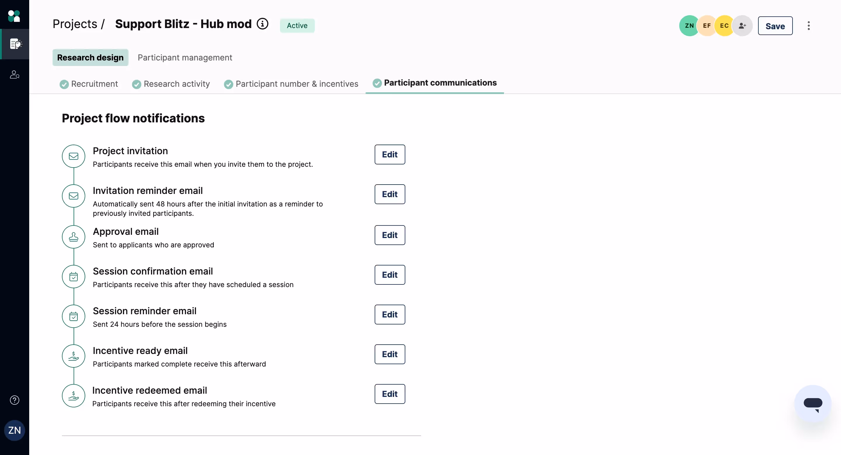 - Navigate to the “Participant communication” tab of a draft or active project