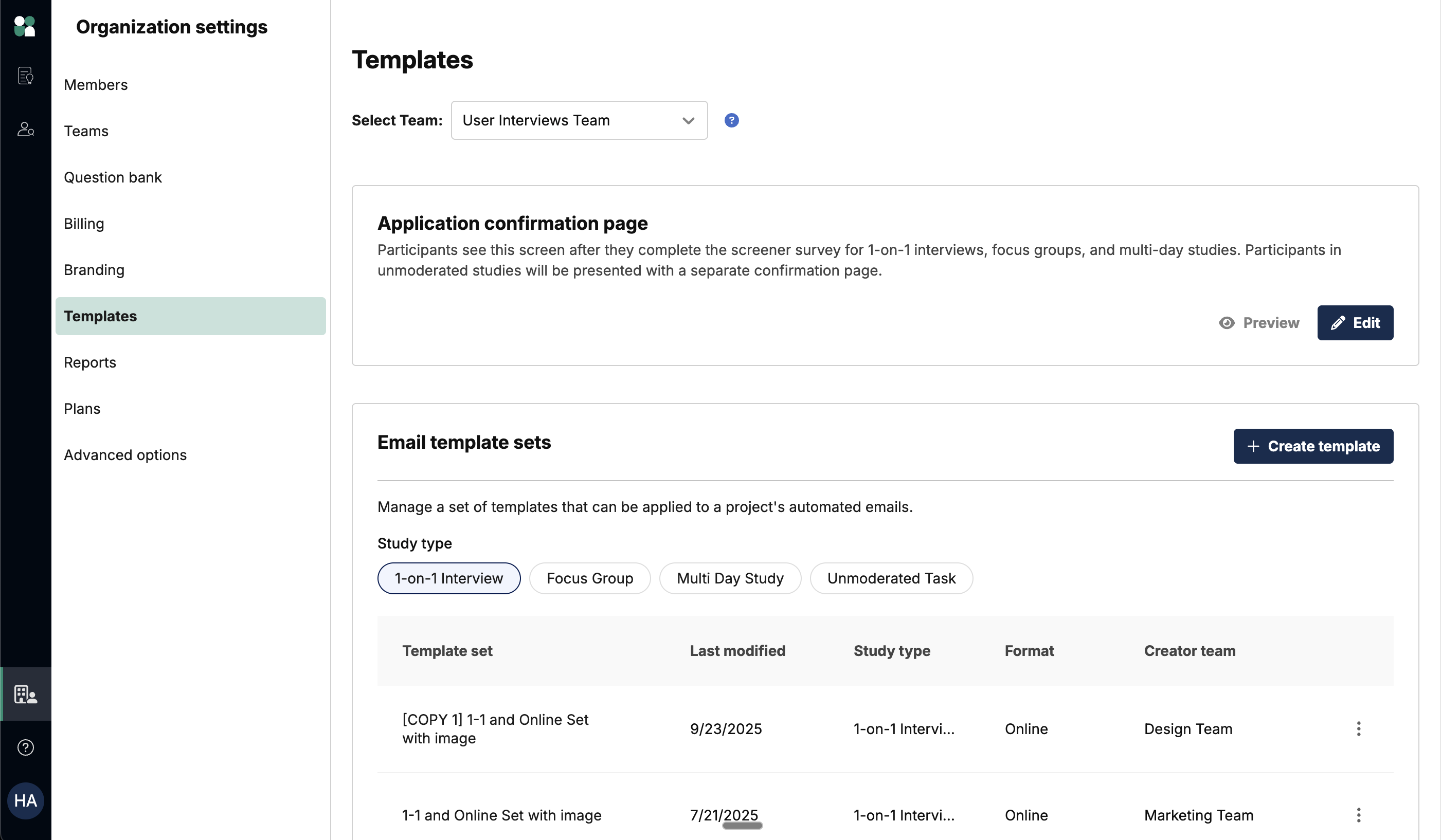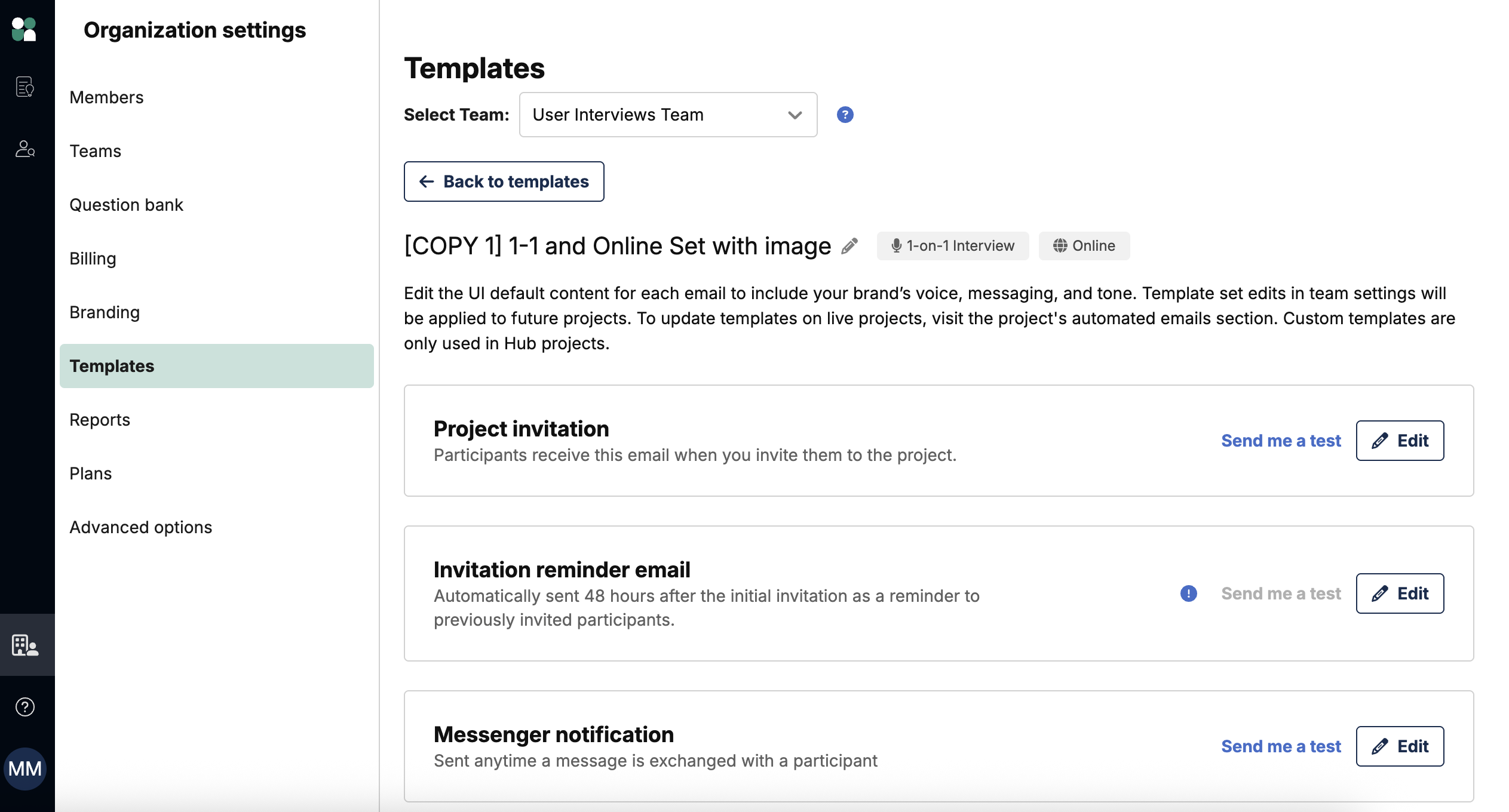Email template sets are templates for all automated emails for a given project type (eg 1-on-1 interview) and format (eg online). This set can be used by all teammates over and over again, removing the burden of copy and pasting custom email content for each project. They allow you to set your tone and voice through your project.