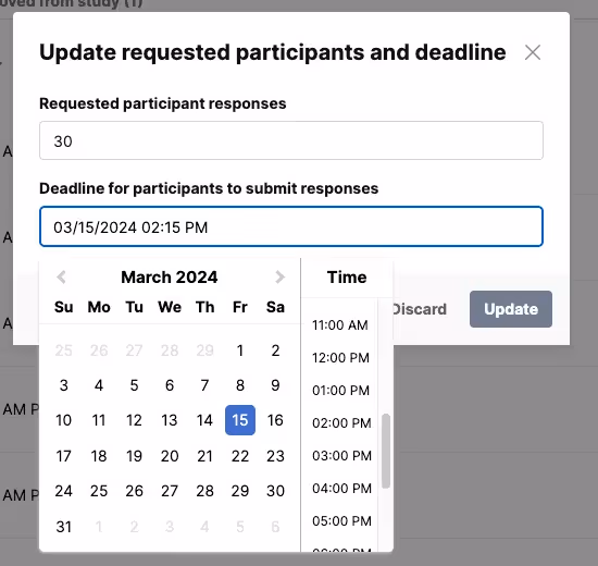 Extending your study is easy to do on User Interviews! We understand that schedules change and sometimes you need a little extra time to complete your research. To extend your study, you'll need to add future dates or extend your deadline, and increase the "Number of Participants" if your study is full. This will signify to your Project Coordinator that you're still looking for participants and we can continue recruitment.