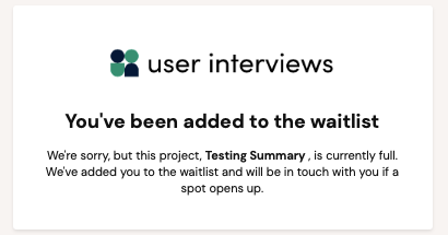 If you are recruiting with your own users via Research Hub, there is no waitlist. Rather, simply re-send invitations and bulk message participants as needed to fill your study.