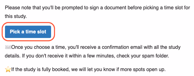8. You'll receive a confirmation email for your booked session! The document will automatically be sent to the researcher, so you're all set to participate. Enjoy your study!