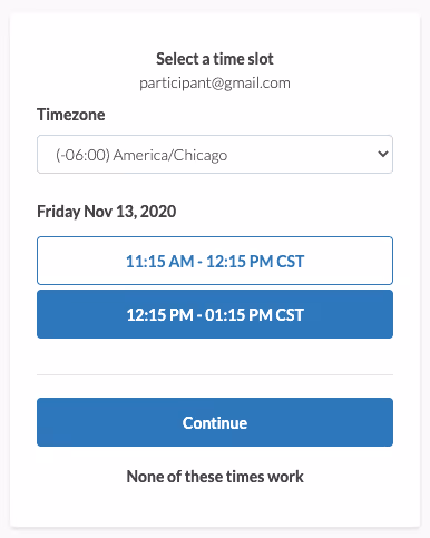 2. Pick from available times, or select Unavailable. Click "Continue".