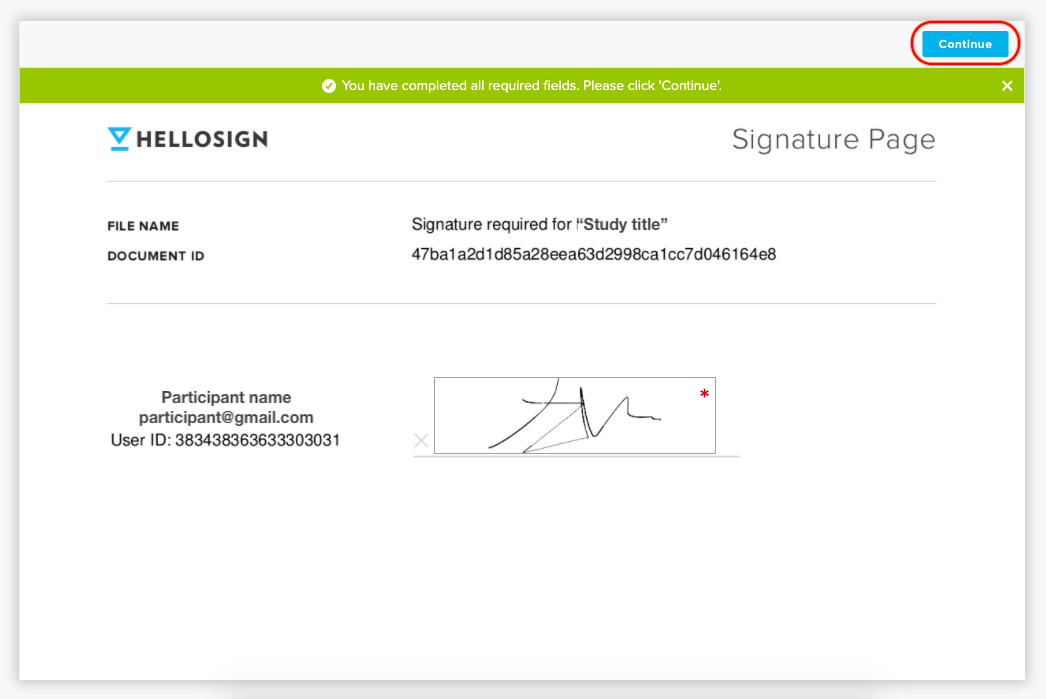 6. The signature will be inserted into the document. Select "Continue".