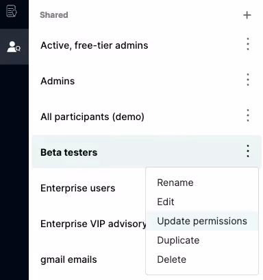 To adjust the permissions of a segment, click the kebab to the right of the segment and click “Update permissions.” You can edit these permissions at any time.