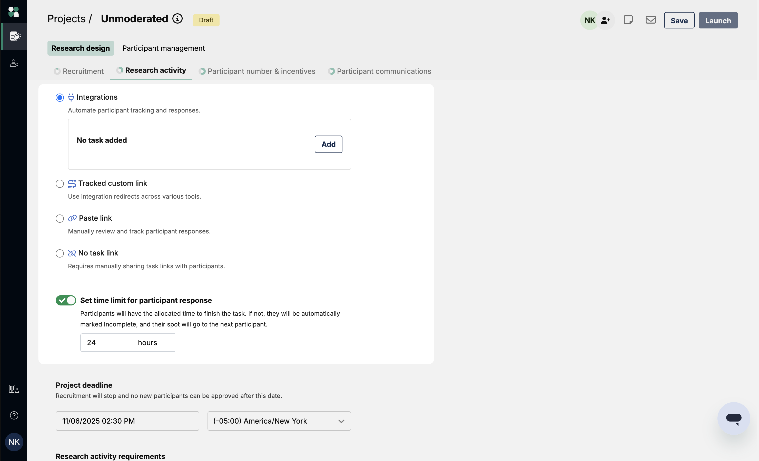To set the time limit, select either Integration or Tracked custom link as your task platform. Toggle on the “Set time limit for participant response” option and choose your desired time limit. By default, we set the time limit to be 24 hours.