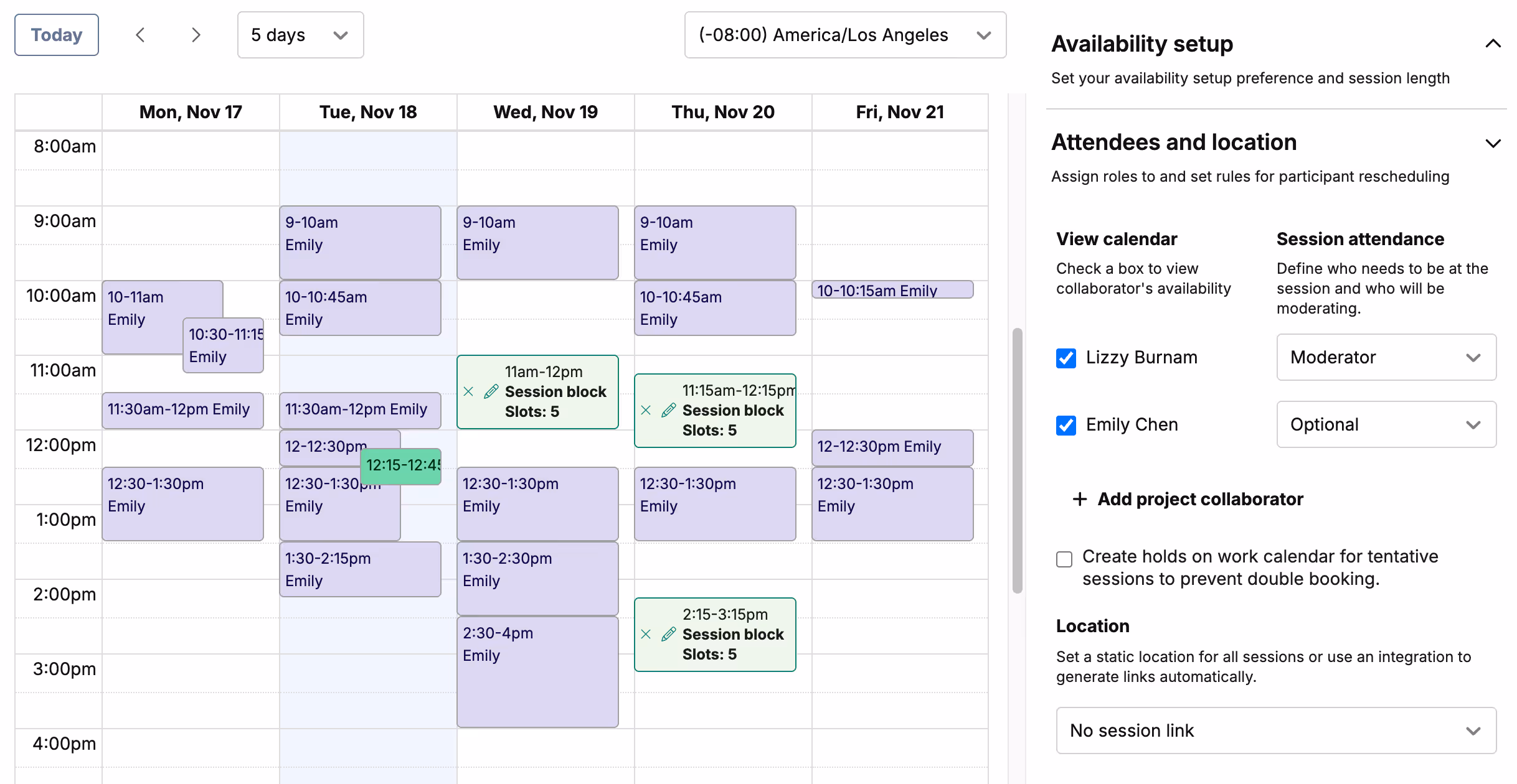 - As with focus groups, you can set the default number of slots in each session to reflect the number of people who can sign up for a specific time. If you'd like to change a session to allow more or less than your default, click the pencil icon in the blue time block. This will let you update each block of time individually.
