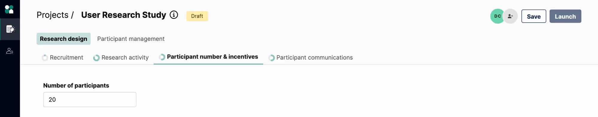 - Similar to focus groups, on the "Participant number & incentives" tab, enter the default number of participants per session.
