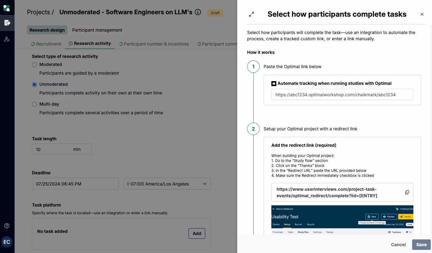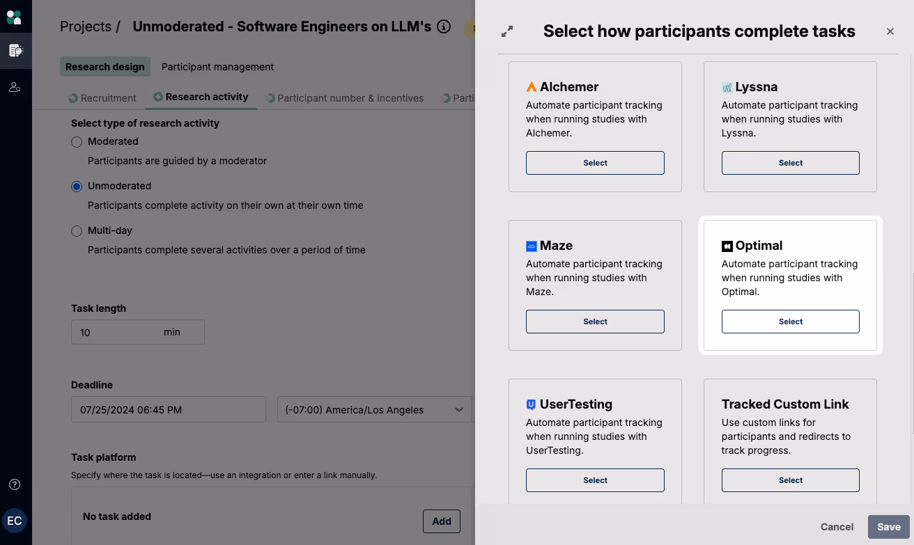 Do you recruit with User Interviews and conduct research with Optimal? Our Optimal integration allows you to connect the two tools for seamless participant recruitment and tracking.