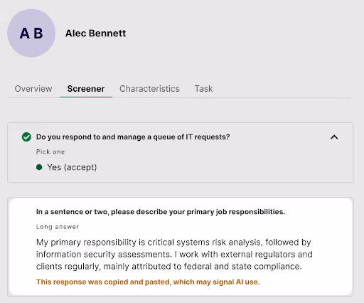 Our system will automatically flag free text screener responses that have been copy-pasted to give you that extra bit of signal when reviewing applicants. Behind the scenes, our automated fraud detection will also catch and ban participants with suspicious pasting activity over time.