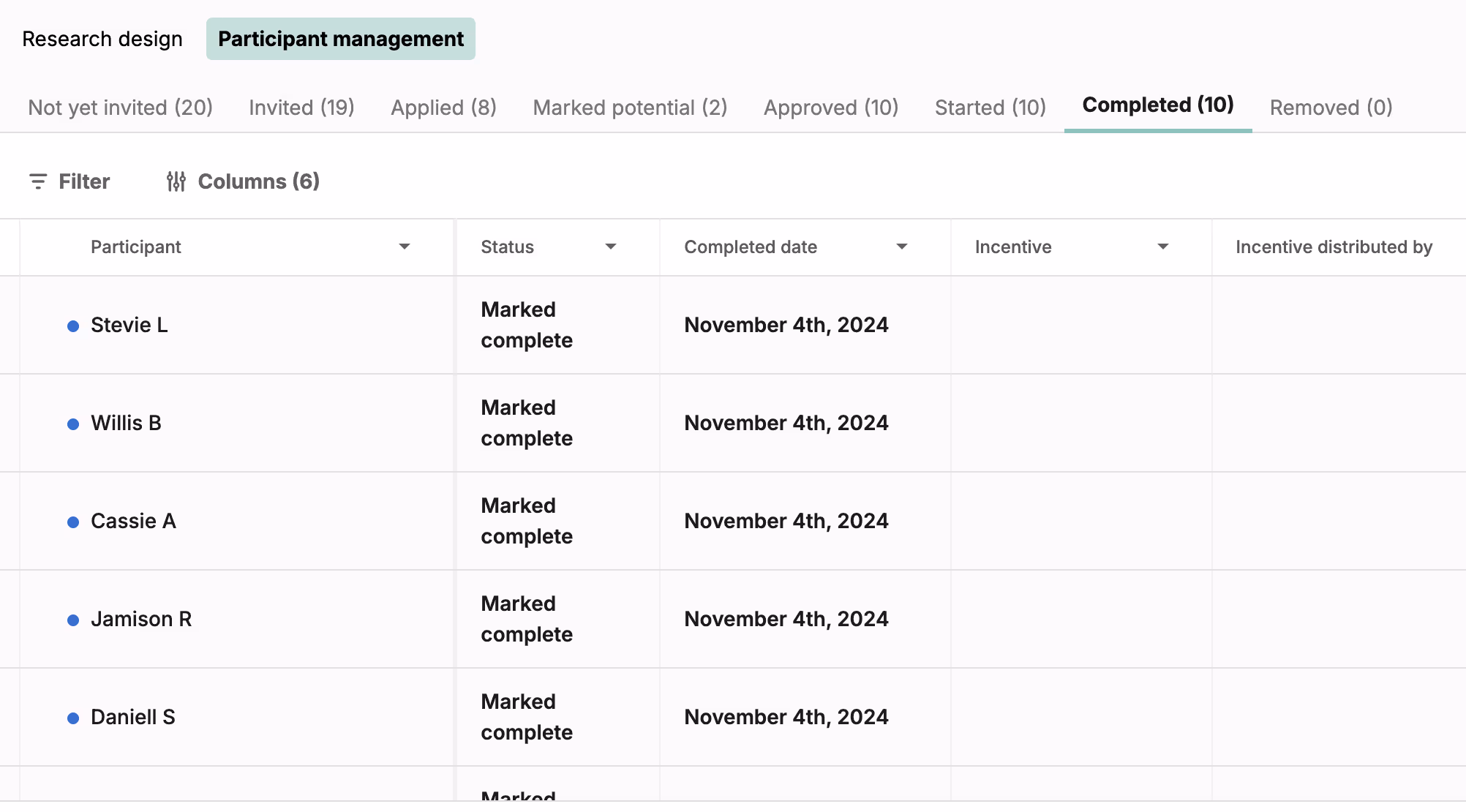 ⚠️ If the study is not using an integration, this view will only show the participant’s name, the date they were marked as “Marked Complete," and the incentive. These researchers need to carefully monitor responses and mark participant attendance accordingly (complete, incomplete, reported, removed).