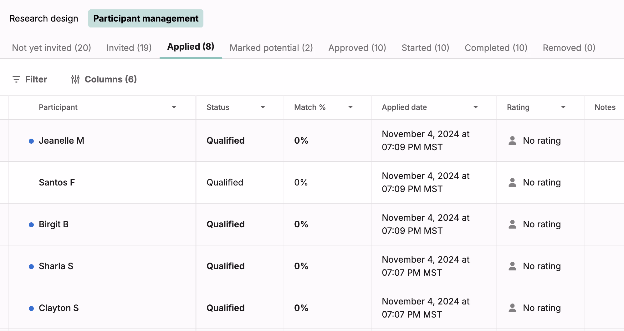This view shows any participants who've been marked as potential by the researcher, but haven't yet been approved. From here, you'll see: