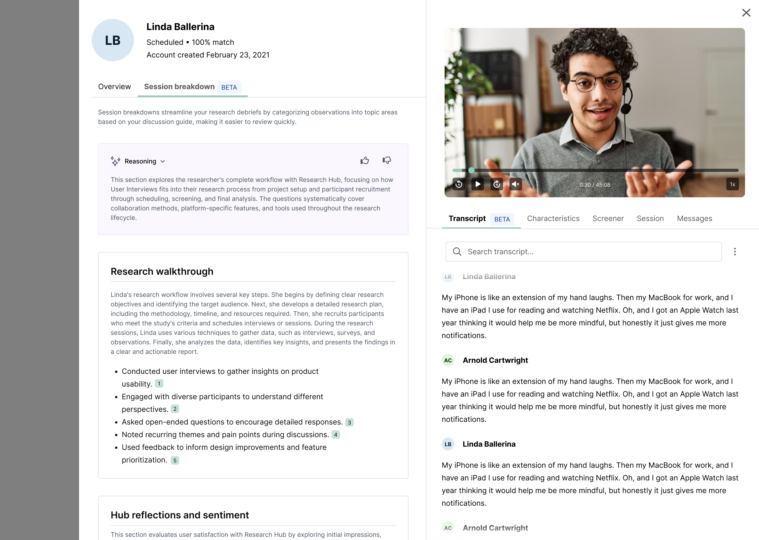 The session breakdown speeds up the research review process by categorizing key observations into topic areas based on your discussion guide. Every observation has citations and links directly to its source quote(s) from the transcript for additional review or context.