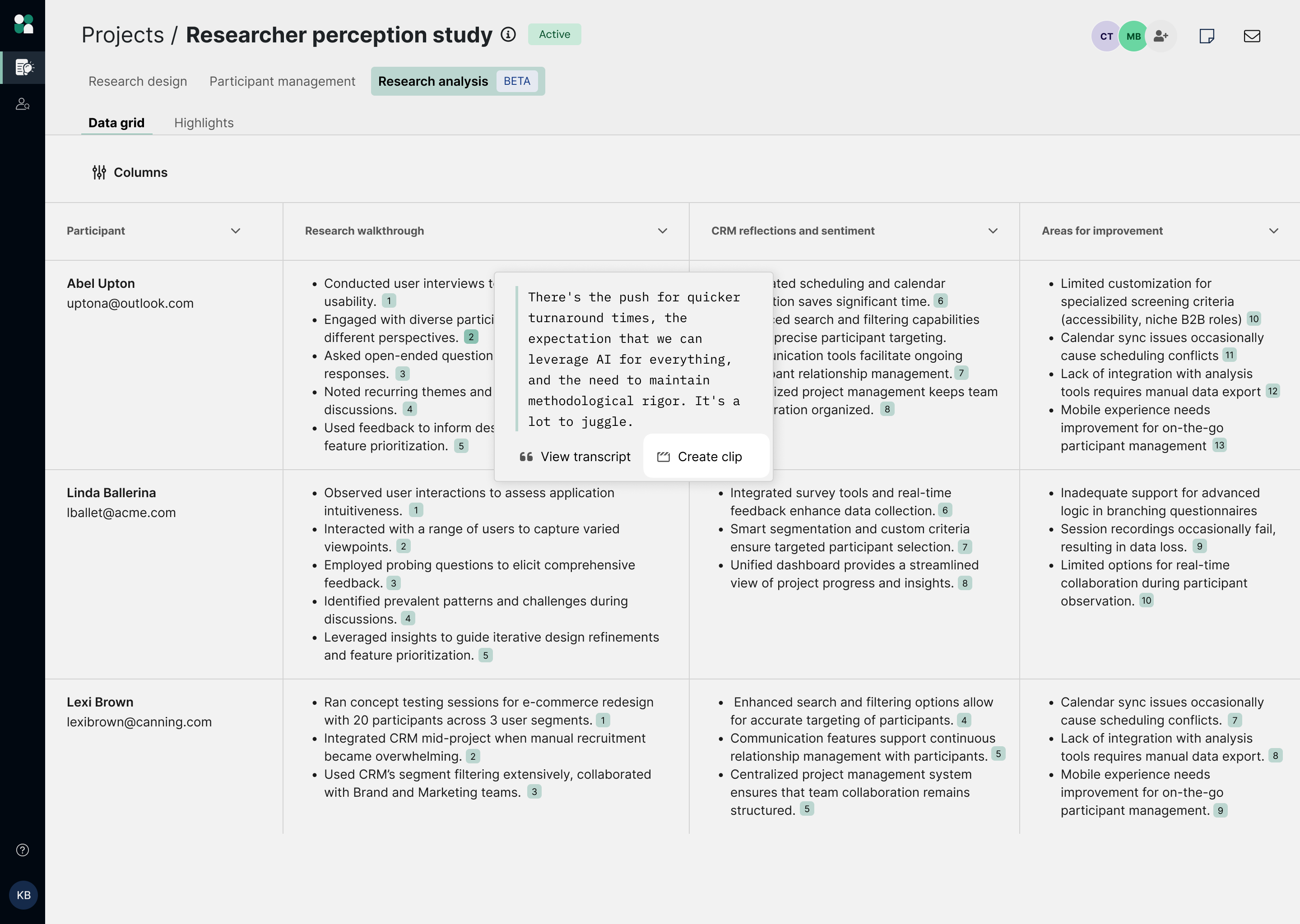 The Data grid allows you to easily compare key observations across participants—integrated with the context of other participant data—all in one place. It’s designed to feel intuitive, while keeping every insight directly connected to source material. The layout looks like this: