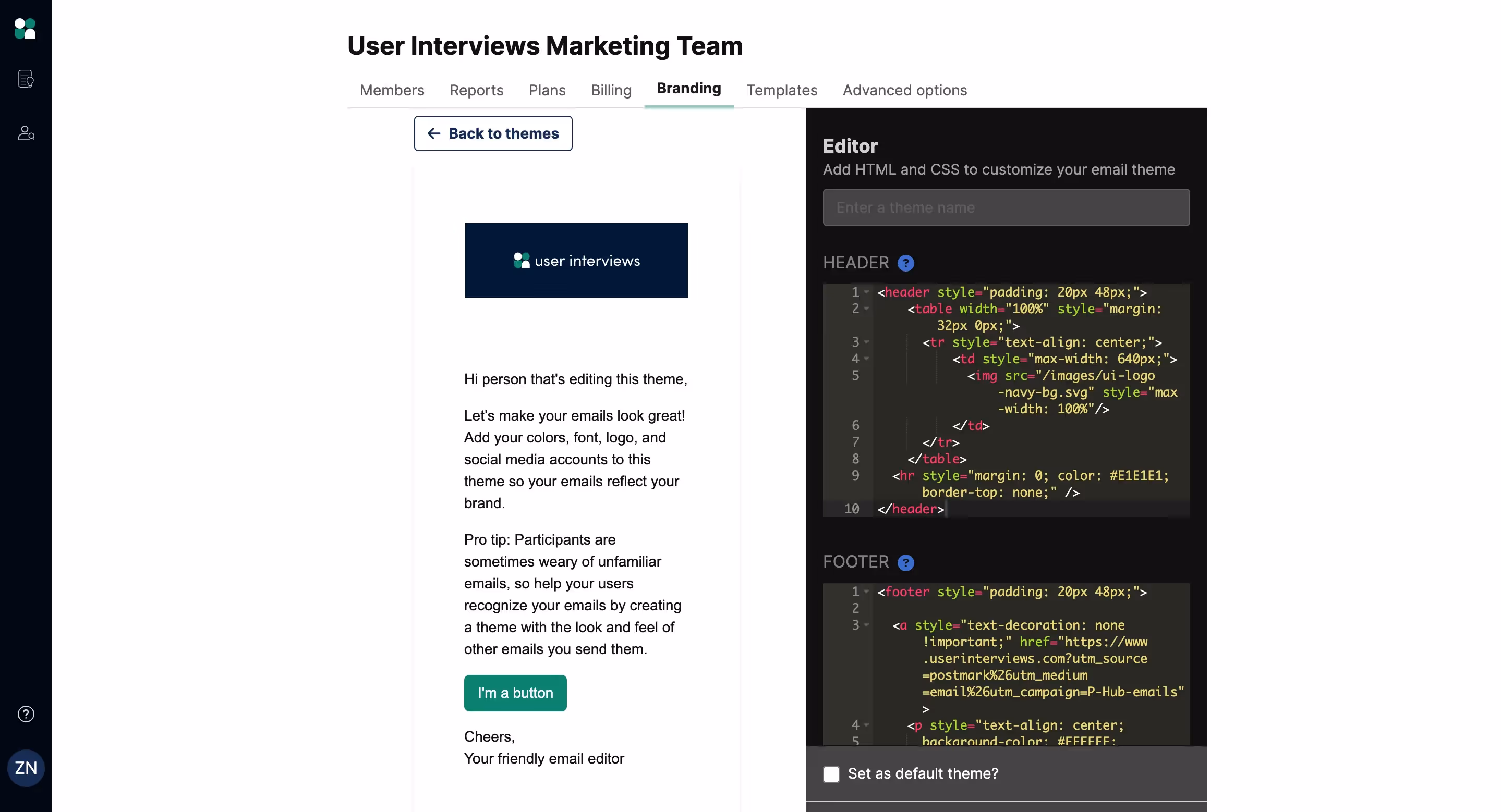 Email themes are created at the team level, then activated at the project level. Your team can create multiple email themes for different uses. Once you’ve set up your themes, it’s easy to apply your chosen theme to any research project.