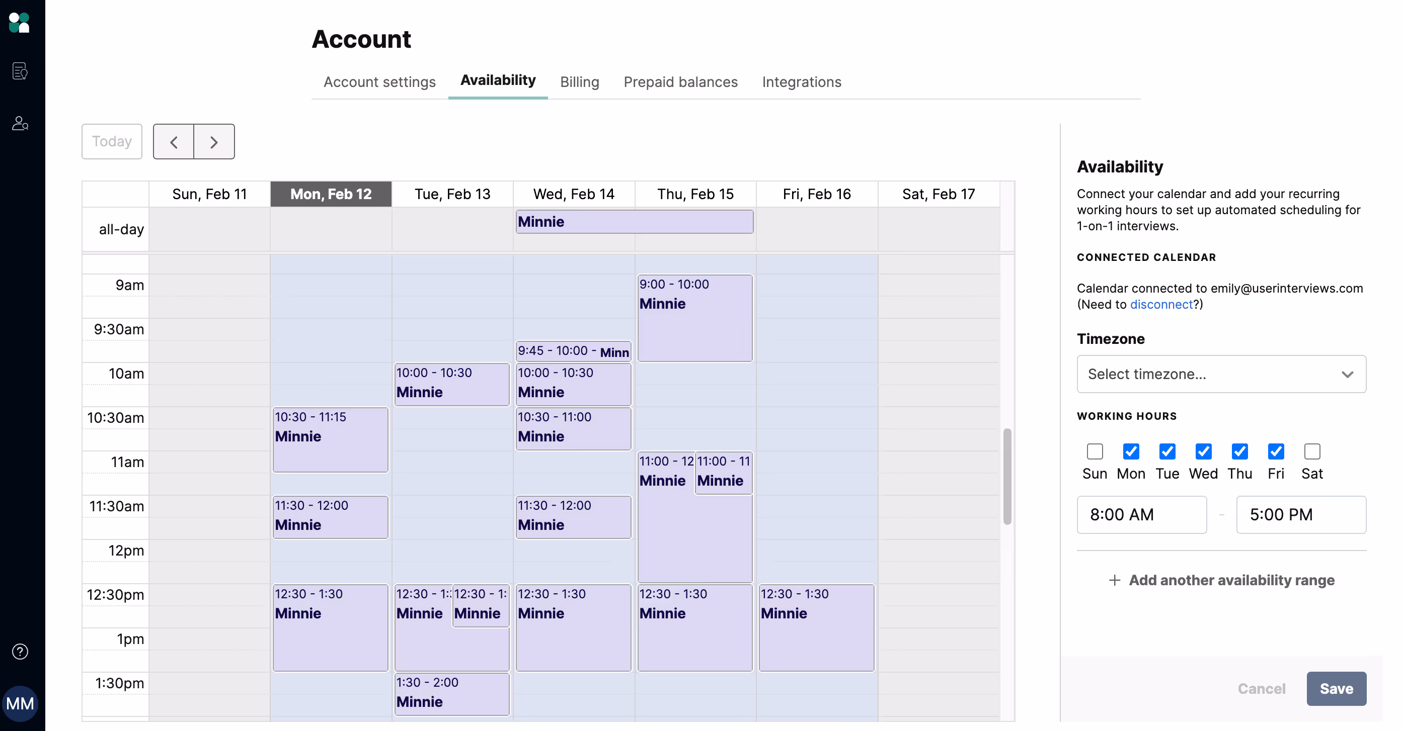 1. Connect your calendar to User Interviews from the Availability page. Click on your username when logged in, select "Account settings" from the menu, and select the “Availability” tab.