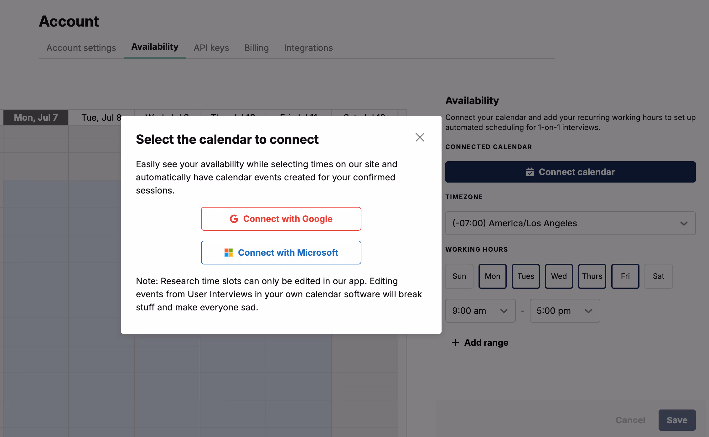 ⛳ To use smart availability for scheduling, you (and your collaborators) must all have your calendars connected to User Interviews.