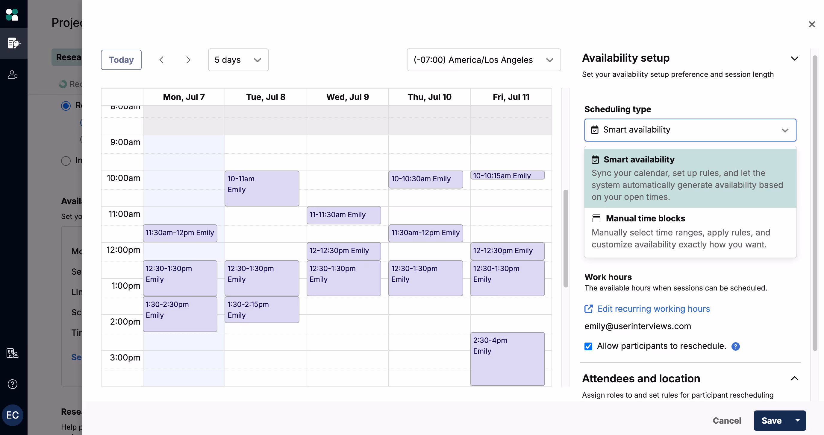 With smart availability, simply set up your calendar, availability, and scheduling preferences, and our system will automate booking confirmed sessions within these guidelines. Smart availability is available for all 1:1 moderated projects, both Google and Outlook calendar.