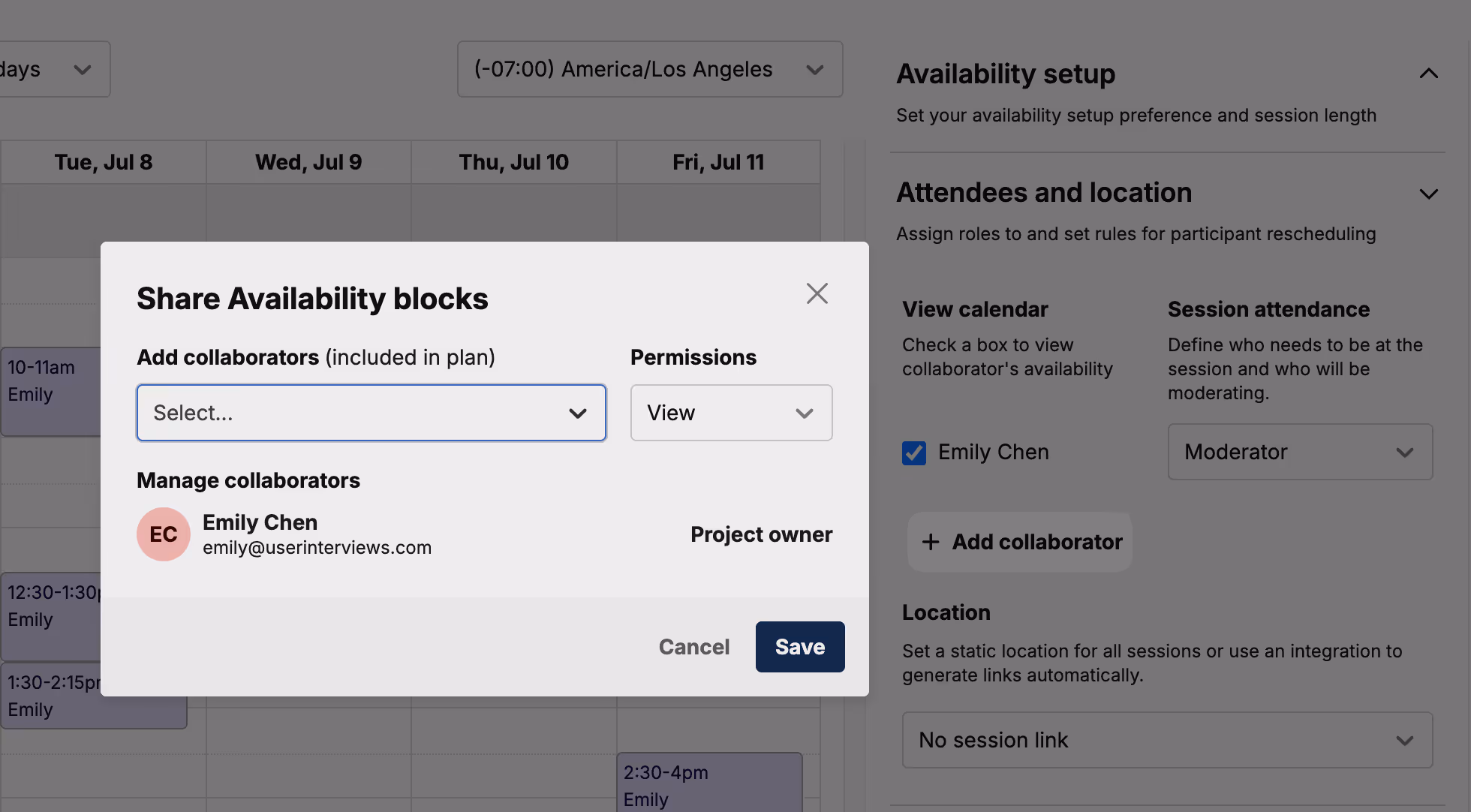 Note: If you are using smart availability with no collaborators, the setup process is the same—as the session moderator, you will be the default owner of the calendar event, and the session location will default to your connected account. You can add collaborators to your project at any time!