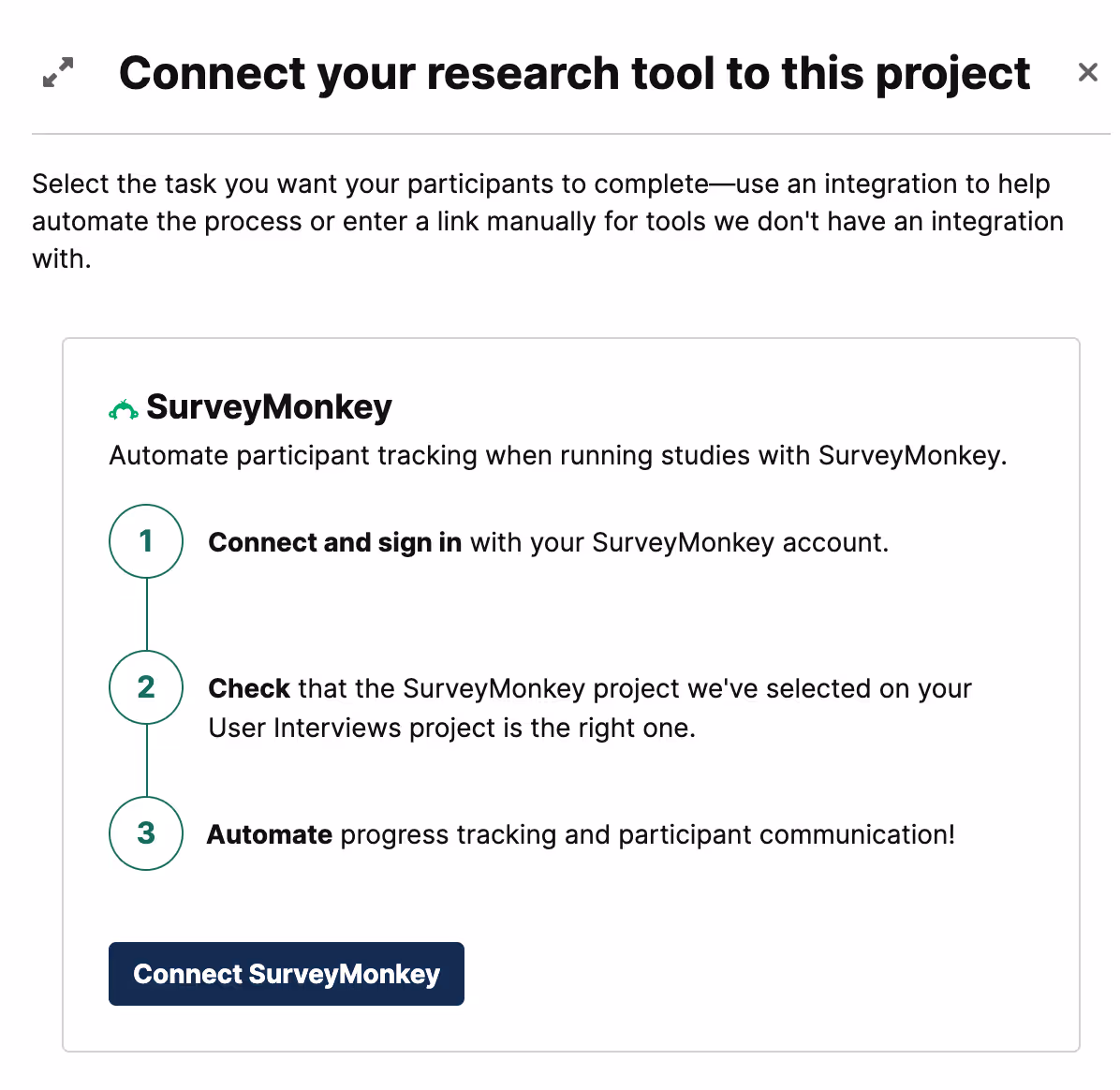 Connect your SurveyMonkey account to your User Interviews account to enable a simple end-to-end study workflow: