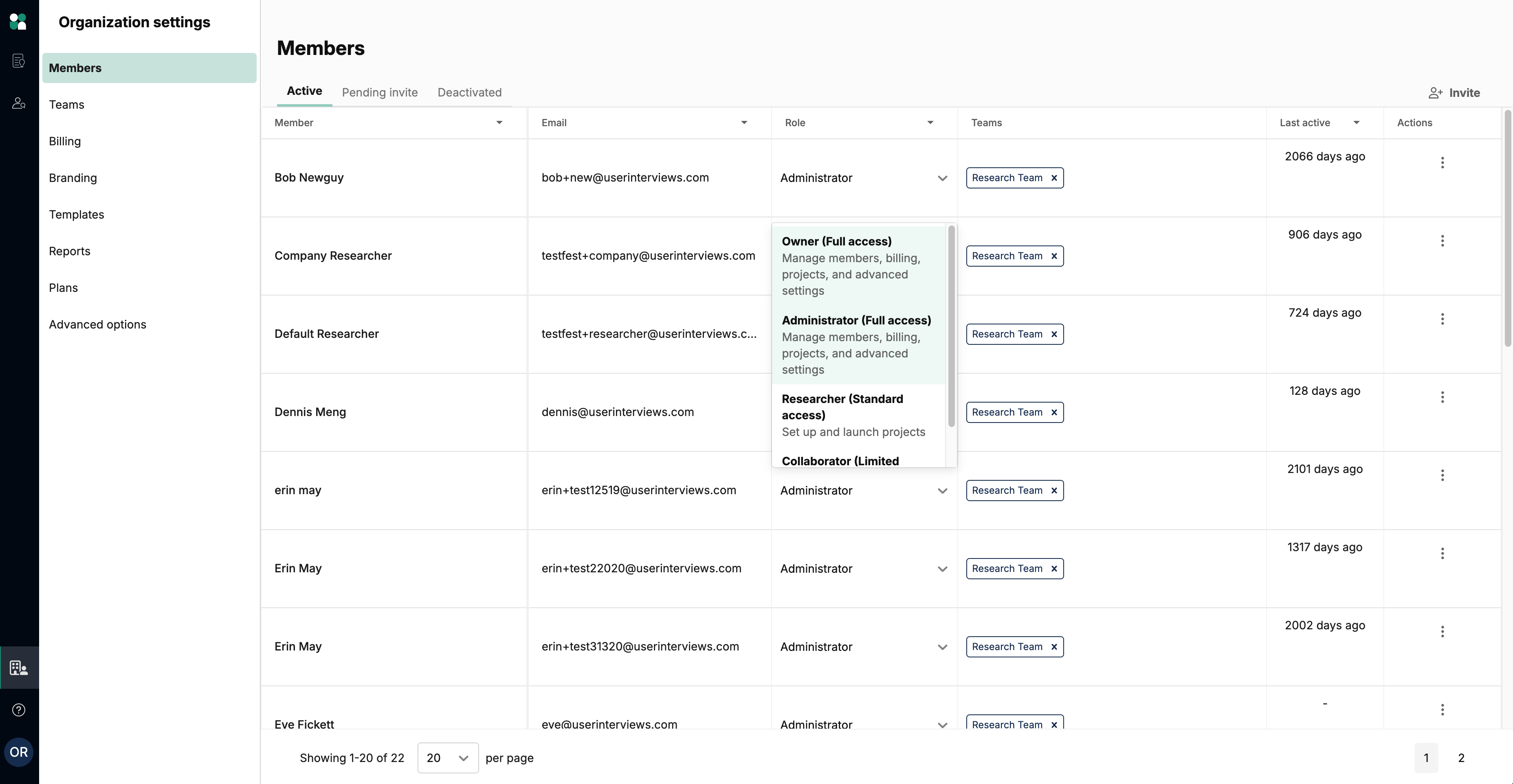 Team roles ensure members of your team are given the right level of access. Currently, User Interviews offers four roles in a team: Owners, Administrators, Researchers, and Collaborators.