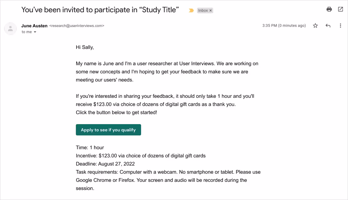 For Hub studies, we provide a default email invitation for unmoderated studies that you can use as a starting point. This is a dynamic template that will automatically pull in key information about your study that you have inputted in the project builder. This includes information such as the incentive amount, session length, task deadline, device requirements, and other key things participants will need to know.