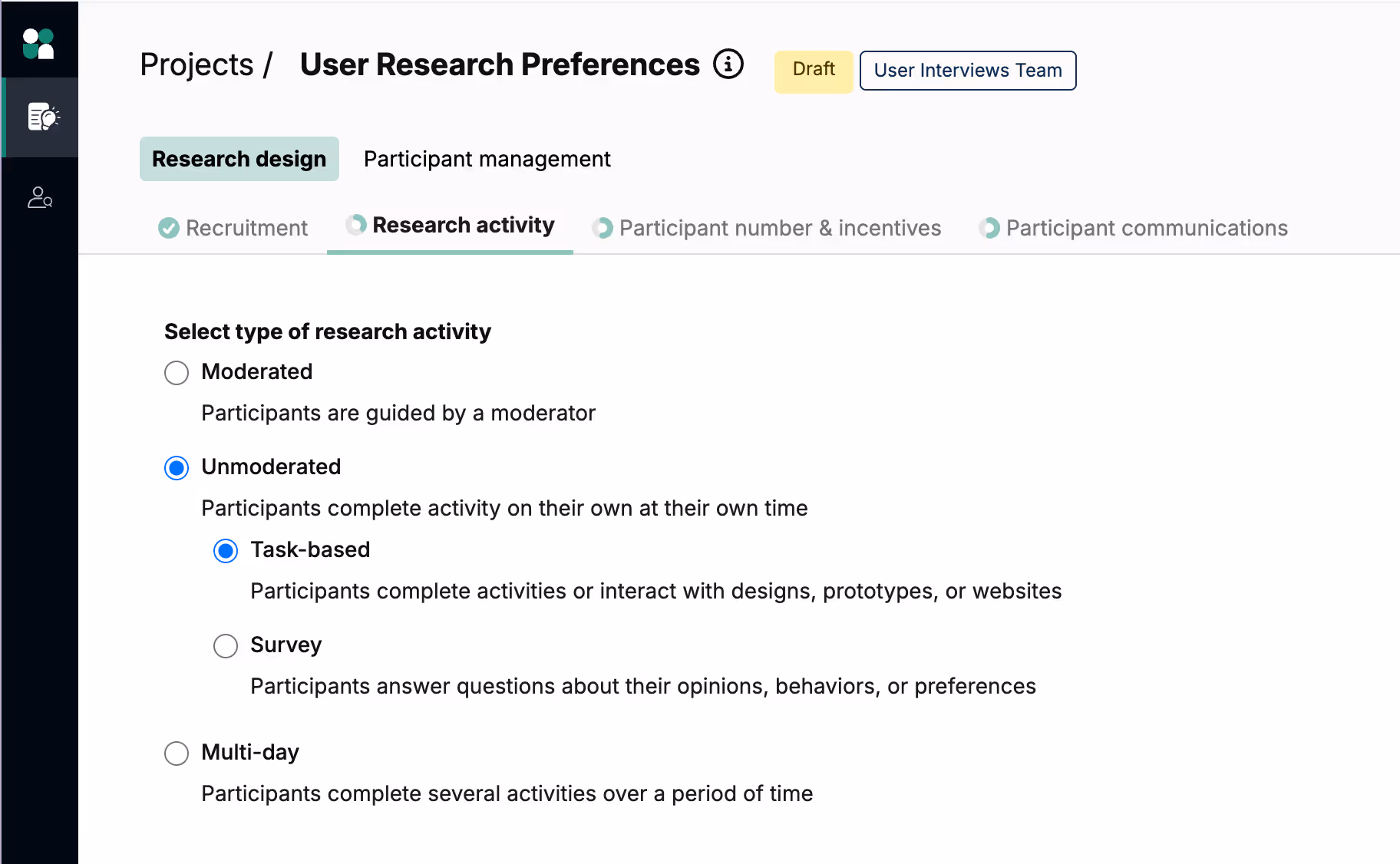 If you select “Unmoderated” at this step, you’ll have a choice between task-based and survey sessions.