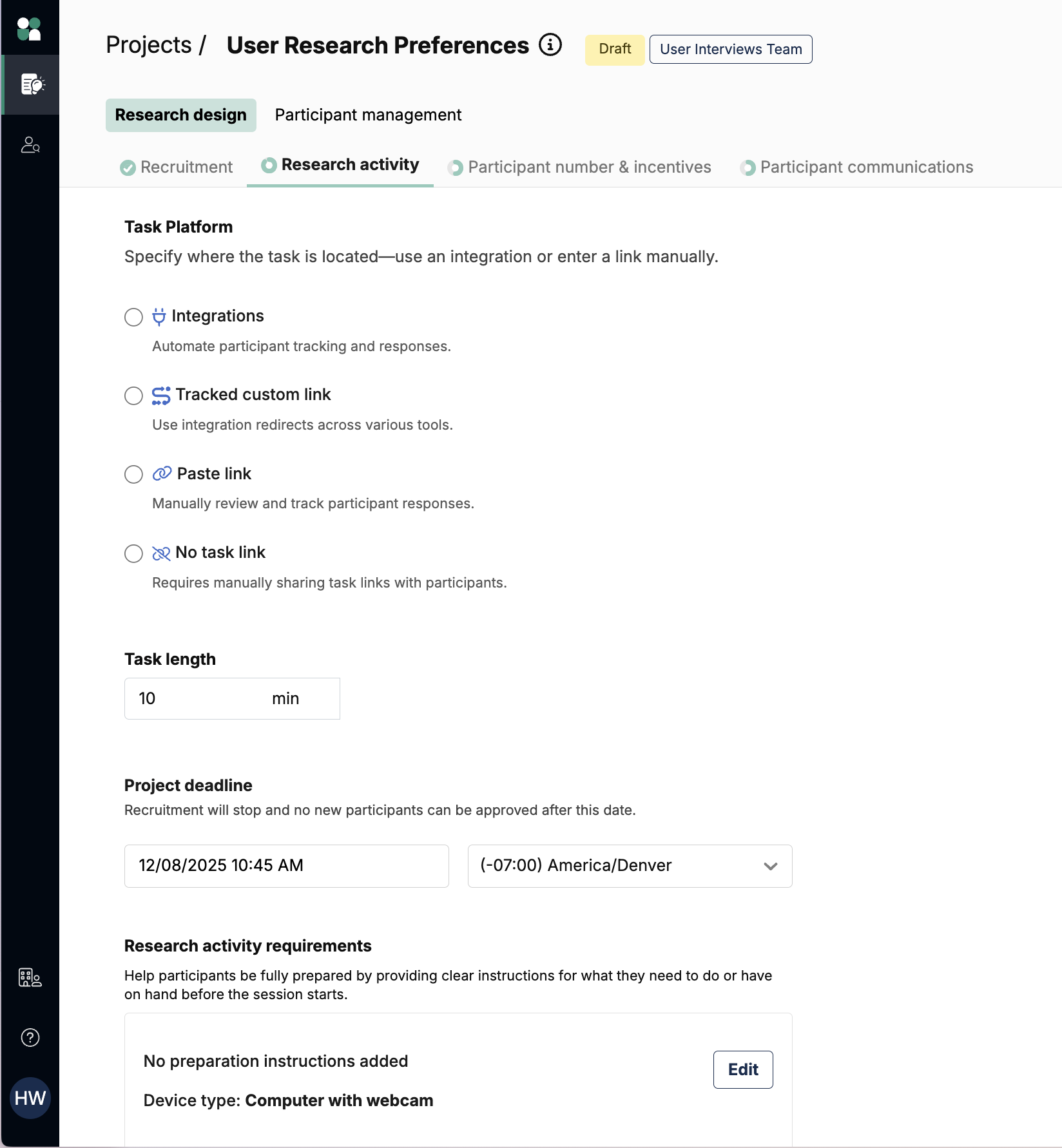 User Interviews offers direct integrations with a number of unmoderated testing tools — but you can actually use any research tool with our system by using a tracked custom link or by manually adding a task link in the project builder.